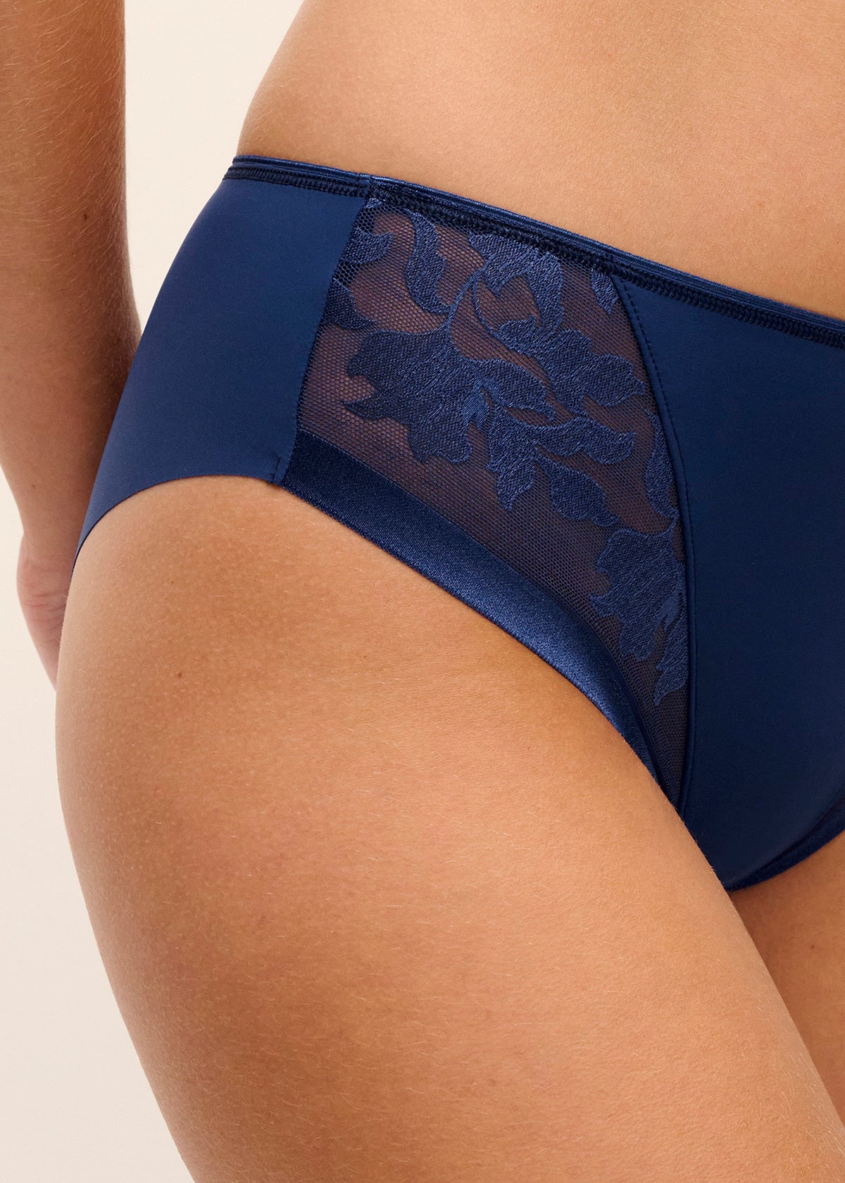 - Integral stretch band in lace allows for a flat clean finish at front waist