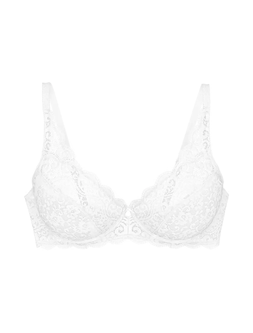 - Softly supportive semi-transparent unpadded cups in comfortable stretch lace